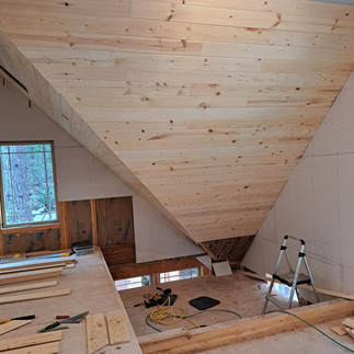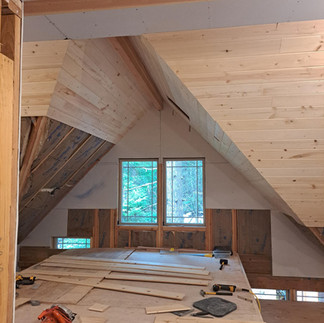 Before the snow hit, we were able to get in a load of white knotted pine stacked in the house for the vaulted area. A friend, who had experience in doing this type of work, who offered to help. Jer and Tom spent two days working on it. The angle cuts are complicated, but I somehow thought once they got things moving, they might finish it in one weekend. I tend to have loftier goals than I should.