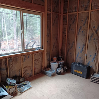 Jer had purchased an air-pressure stapler but it only lasted two hours. That left him to hand-stapled almost the entire house. Today, his hand is trying to recover. Like all the other steps of building a house, I thought this would be easier, but it was a lot of hard work. Still, the exterior walls are nearly completed and a couple interior walls are insulated. Let’s take a moment to be grateful. Pause.